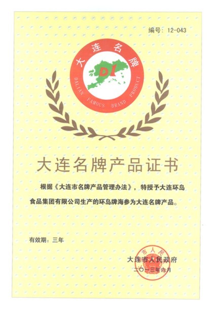 慶祝環(huán)島牌海參被大連市人民政府授權為“大連名牌產(chǎn)品”